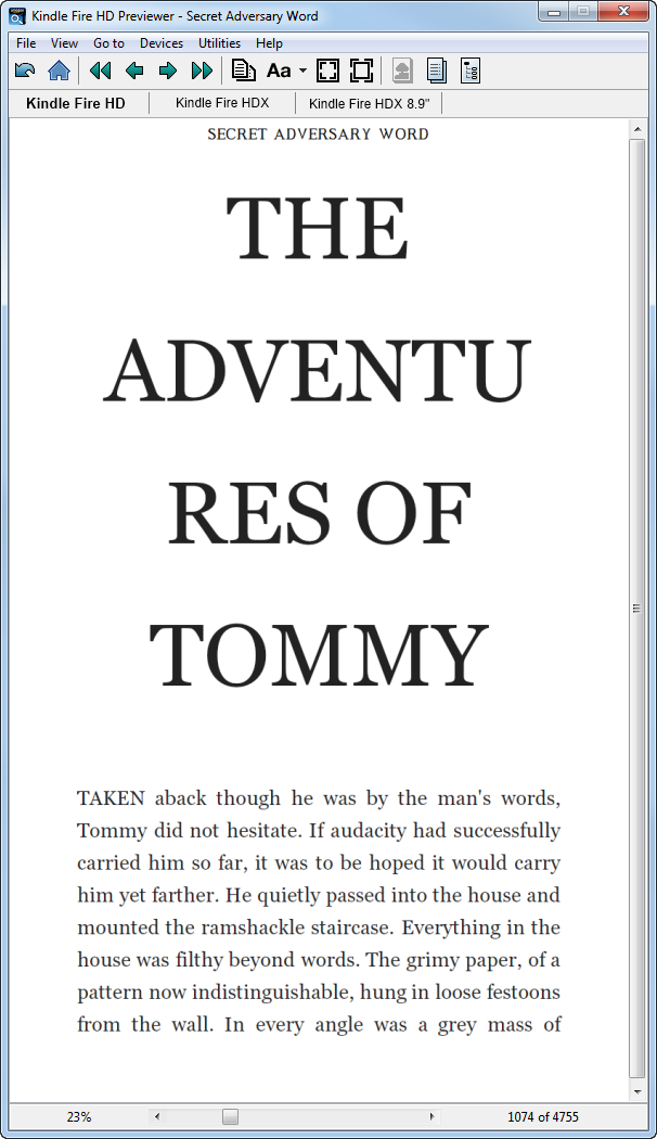 As a simple test, here's the same exact book. Word for word. On the left is the book (for reference, it's Agatha Christie's "Secret Adversary," one of the Tommy and Tuppence books) made with a simple Word file, uploaded at the KDP. In the middle, the same book, made with one of those "buy a bookmaking template for only $49.95!" websites. (You can click any of them to lightbox and enlarge for a closer view!) On the right, is the book as we made it, here at Booknook.biz. We didn't do anything spectacularly "special" to it, other than using a chapter-head font. Now, there's nothing wrong, really, with the book on the left. We've certainly seen worse. The book in the center, I think we can all agree, is going to be hurt at Amazon's LITB. The book on the right? Would you hesitate for a moment, about buying that book? No--you wouldn't. because you can tell that it's a professional, commercial book. Nothing on that page scares you away from trusting that author and that publisher. Isn't that what you want for your book?