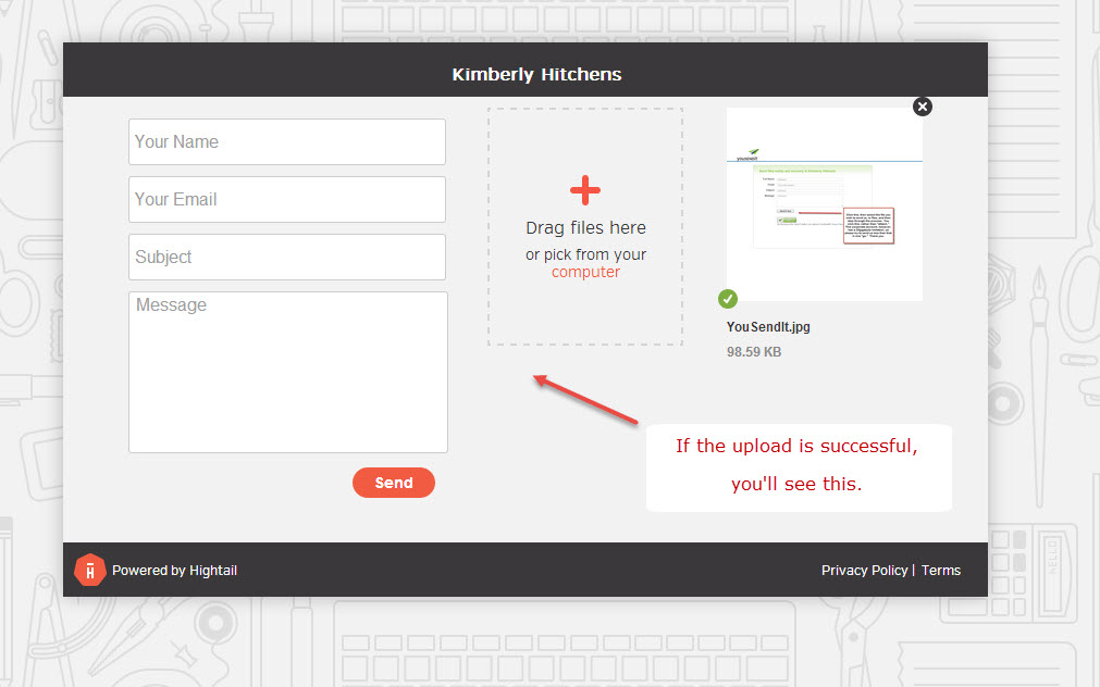 Hightail Step 2--once your files have successfully uploaded to the Uplink, you will see this page.  Please make sure you fill in the information and click SEND to complete the transmission.